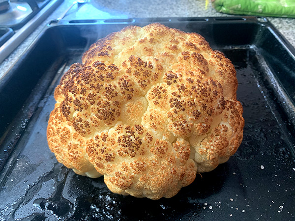 4. Retirar la bandeja con cuidado y disponer la mantequilla sobre la corona de la coliflor, presionando con la mano.